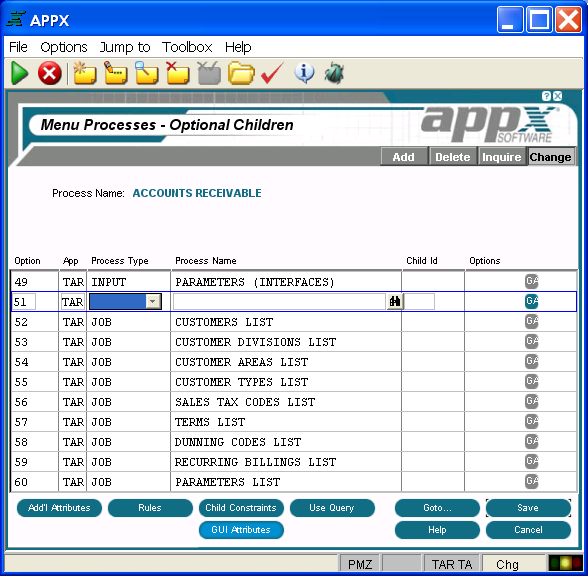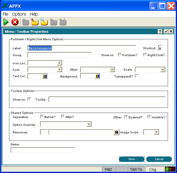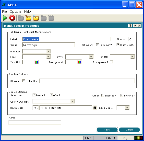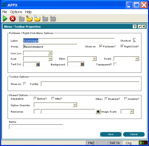 · Name is the name assigned to this GUI Attribute. The name is used for controlling the GUI object with ILF code so that, for example, certain selections could be disabled by user id.